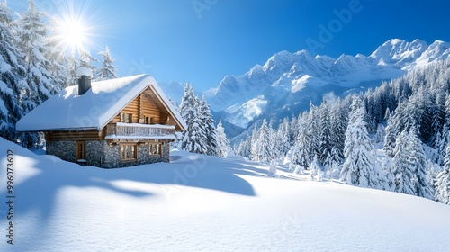 Naklejka premium Bright winter landscape with sunlit snow-covered chalet and evergreen forest, creating a picturesque ski resort scene with rustic wooden architecture and winter wonderland.