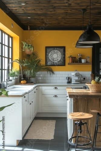 Fototapeta premium Bright Yellow and White Kitchen Interior Design with Wood Accents