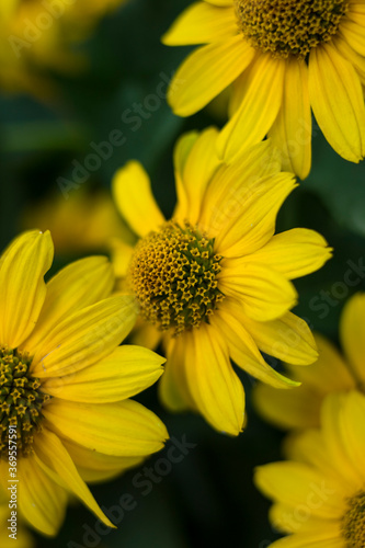 © Ирина Сизоненко, Fototapeta premium Bright yellow arnica flowers with green leaves