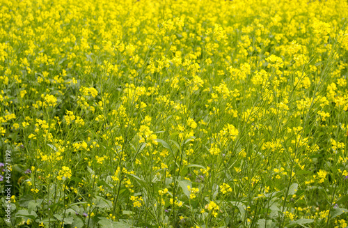 Fototapeta premium Bright yellow blooming rapeseed field. Simple floral background