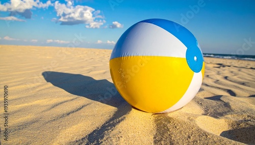 Obraz premium Bright yellow blue beach ball on sandy shore with clear sky summer vibes