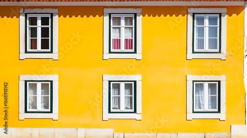 © sahadat, Fototapeta premium Bright Yellow Building Facade Six Windows European Architecture