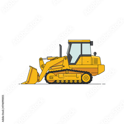 © RER03, Naklejka premium Bright yellow bulldozer with a large bucket and tracks depicted in a clean modern flat illustration style on a white background