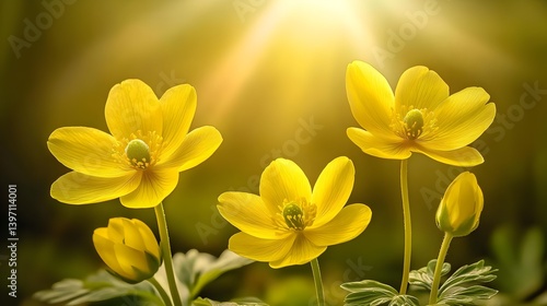© Neungruedee, Fototapeta premium Bright Yellow Flowers Blooming in a Spring Meadow Under Sunlight