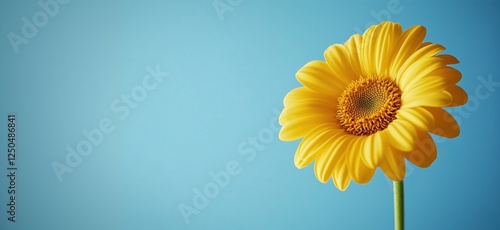 © Vergiliy, Obraz premium Bright yellow gerbera daisy against a clear blue sky background, copy space for text