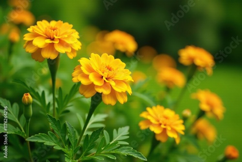 Fototapeta premium Bright yellow marigold flowers blooming in a garden, color, greenery