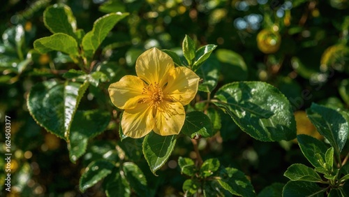 Obraz premium Bright yellow Pereskia bleo bloom accompanied by green leaves on a tree