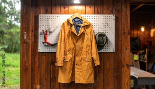 Fototapeta premium Bright Yellow Rain Jacket Hanging on Wooden Wall with Tools