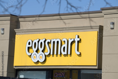 © eugen, Fototapeta premium bright yellow sign of Eggsmart, a breakfast restaurant chain, located here at 312 O'Connor Dr, Toronto