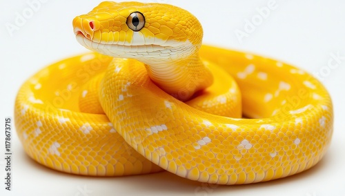 Fototapeta premium Bright Yellow Snake with Distinctive Patterns Coiled Elegantly on White...