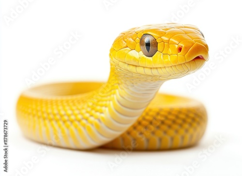 Naklejka premium Bright Yellow Snake with Smooth Scales on White Background, Captivating Reptile Close-Up, Fascinating Wildlife Photography for Nature Lovers and Educational Purposes