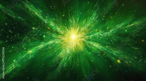 © btiger, Naklejka premium Bright yellow starburst radiating dynamic green and yellow streaks with scattered glowing particles creating a cosmic energetic scene