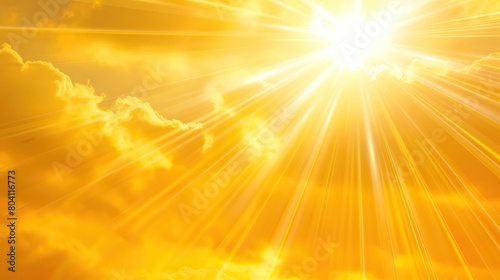 Obraz premium bright yellow sun shining through white clouds. The sun's rays are extending...