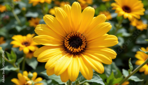 Fototapeta premium Bright yellow sunflower blooms in vibrant garden, showcasing its large petals and dark center, surrounded by lush green leaves and other sunflowers, creating cheerful atmosphere