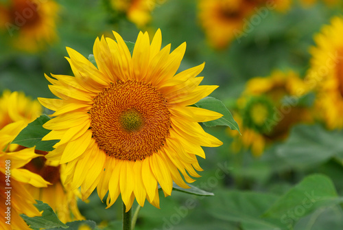 Fototapeta premium Bright yellow sunflower close up on a background field