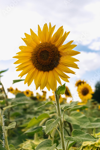 Fototapeta premium Bright yellow sunflower head rising tall among a vibrant field of sunflowers, set against a backdrop of cloudy sky on a warm summer day, radiating natural beauty and tranquility. Agriculture, farming