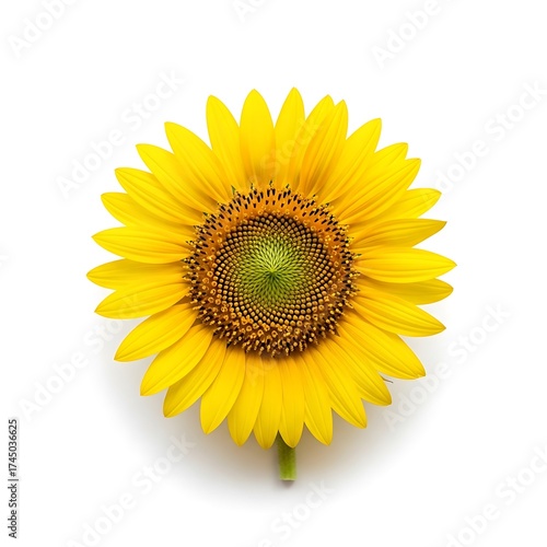 © Galuh, Fototapeta premium Bright yellow sunflower head with green and brown center disc florets, viewed from above, isolated on a clean white background.