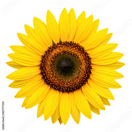 Fototapeta premium Bright yellow sunflower with a dark brown center and symmetrical petals radiating outward in a circular pattern