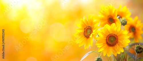 © Kakabe, Fototapeta premium Bright yellow sunflowers in full bloom against a soft-focus golden background, perfect for summer-themed designs, advertisements, and greeting cards, evoking warmth and positivity,