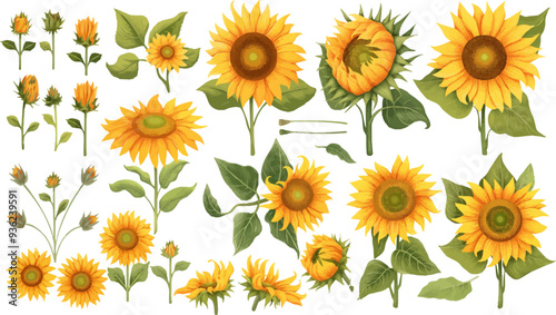 © Tipakorn, Obraz premium Bright yellow sunflowers in full bloom isolated on a white background, capturing the beauty of summer and nature