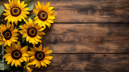 © Aura, Obraz premium bright yellow sunflowers on a brown wooden table with space for text