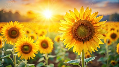 Fototapeta premium Bright yellow sunflowers stand tall in a field with blurred sunny background, field, golden, field, golden