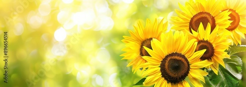 Fototapeta premium Bright yellow sunflowers with a blurred green background, in a banner format,...