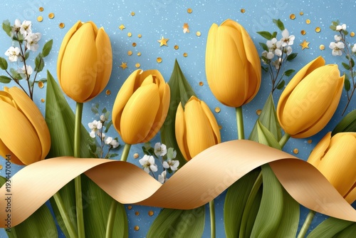 © Georgii, Fototapeta premium Bright yellow tulips with ribbon and gold stars on a blue background for spring celebration