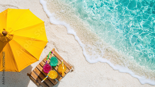 © Neural Canvas, Fototapeta premium Bright yellow umbrella on sandy beach with colorful drinks by water