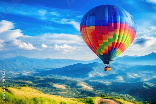 © Andrii , Obraz premium Brightly Colored Balloon Floating Over Green Meadows