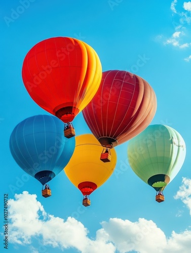 © Anat art, Naklejka premium Brightly colored balloons float freely against a clear blue sky, showcasing their vivid hues on a sunny day. Generative AI