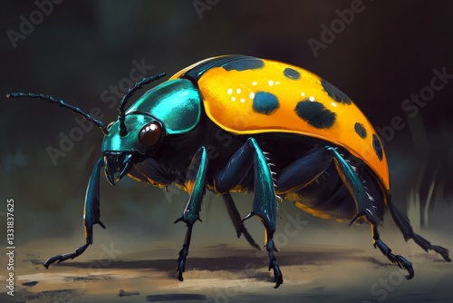 Naklejka premium Brightly colored beetle on the forest floor under soft natural light during...