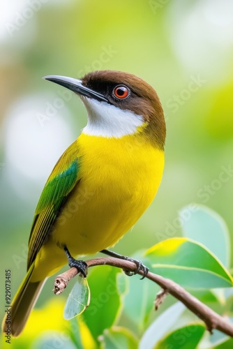 Fototapeta premium Brightly colored bird perched on a branch in a lush green forest during daylight