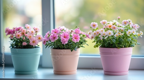 Fototapeta premium Brightly colored flower pots arranged on windowsill, showcasing