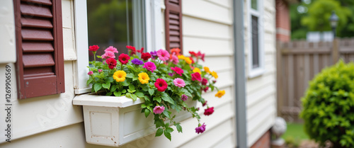 Fototapeta premium Brightly colored flowers in a white window box create a cheerful atmosphere,...