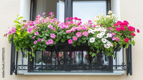 © Sawat, Fototapeta premium Brightly colored flowers in hanging pots creating a cheerful balcony view.