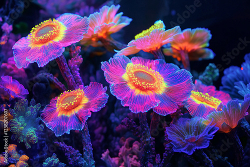 Obraz premium Brightly colored glowing flowers under dark background create a striking...