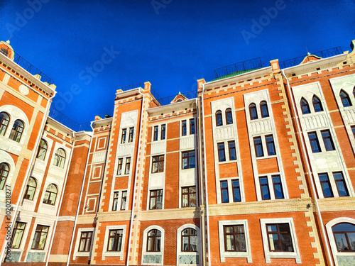 © keleny, Fototapeta premium Brightly colored historic building exterior under a clear blue sky in an urban setting during daylight hours