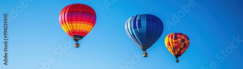 © Fokasu Art, Naklejka premium Brightly colored hot air balloons floating across a clear blue sky, vibrant patterns in flight, background, joyful adventure
