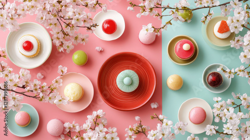 Fototapeta premium Brightly colored Japanese desserts arranged on pastel plates with cherry...