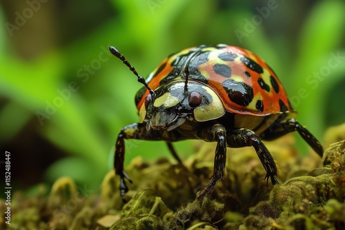 Naklejka premium Brightly colored ladybug resting on moss in a lush green environment