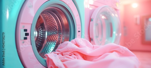 Obraz premium Brightly colored laundry machines with clothing in a modern laundromat during...