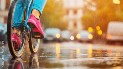 Fototapeta premium Brightly colored sneakers splash through rain on a bike ride in the city