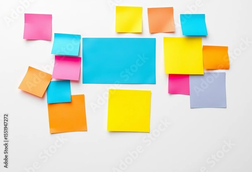 Fototapeta premium Brightly colored sticky notes and paper stickers on white background, colorful, stickers