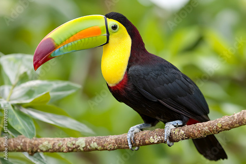© Klemenso, Naklejka premium Brightly colored toucan perched on a tropical branch in a lush setting Generative AI