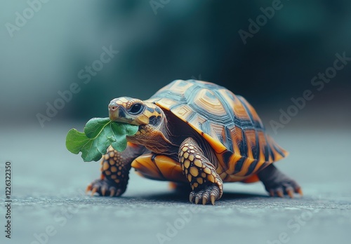 © ANUAR, Fototapeta premium Brightly Colored Turtle with Leaf in Mouth Crawling on a Concrete Surface in a Natural Outdoor Setting