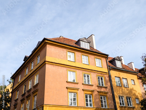 Fototapeta premium Brightly illuminated historic pale yellow tenement house with numerous small...