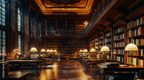 © amorn_m, Obraz premium Brightly lit library with rows of books and study areas High quality images