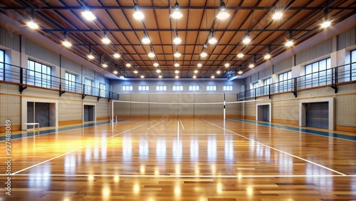 Fototapeta premium Brightly lit, modern indoor volleyball court with polished wood floors,...