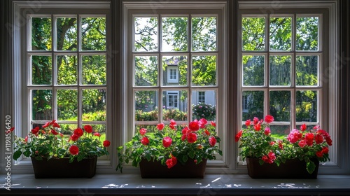 © Kaizenart, Fototapeta premium Brightly lit window view showcasing vibrant flowers in pots, with a lush garden background